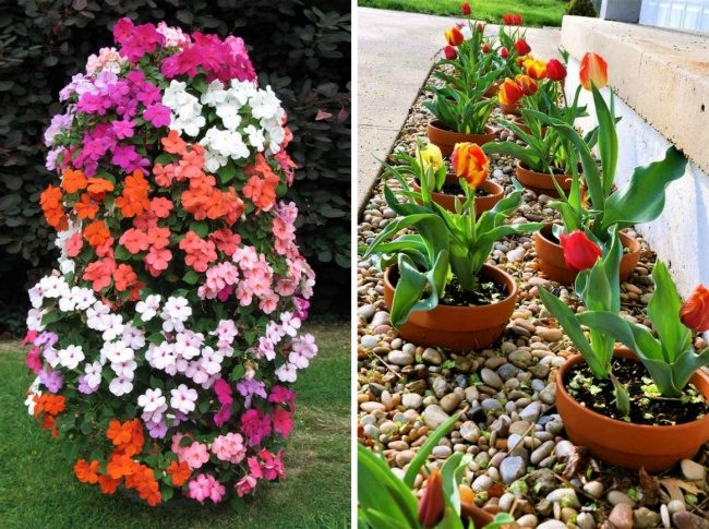А можно и не высаживать, а просто разместить в горшках, как здесь. Еще один простой вариант — поставить вертикальные клумбы.