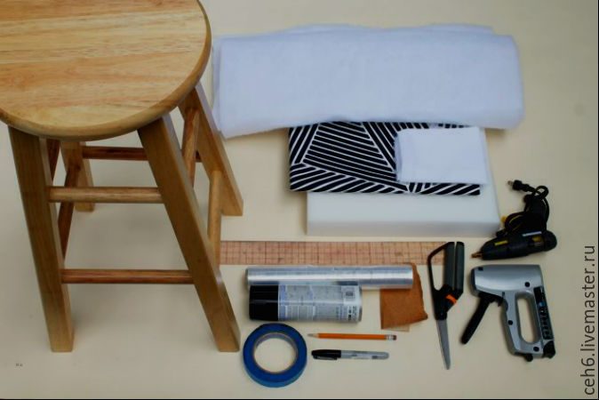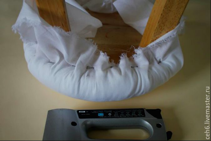 Основным инструментом здесь будет являться — степлер. Но, если за основу брать металлический стул — то скреплять нужно горячим клеем.