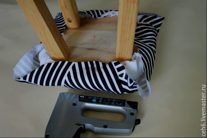 Возьмите любую подкладочную ткань и прикрепите к сиденью таким же образом, как и ватин.