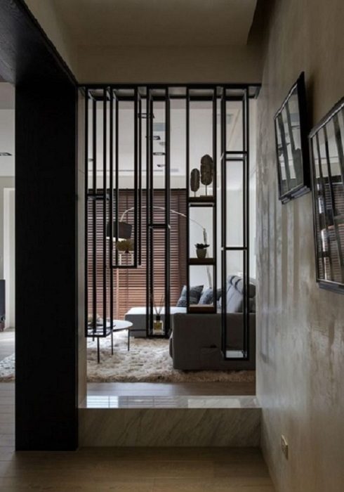Декоративная металлическая межкомнатная перегородка, которая визуально продлевает широкий дверной проём.