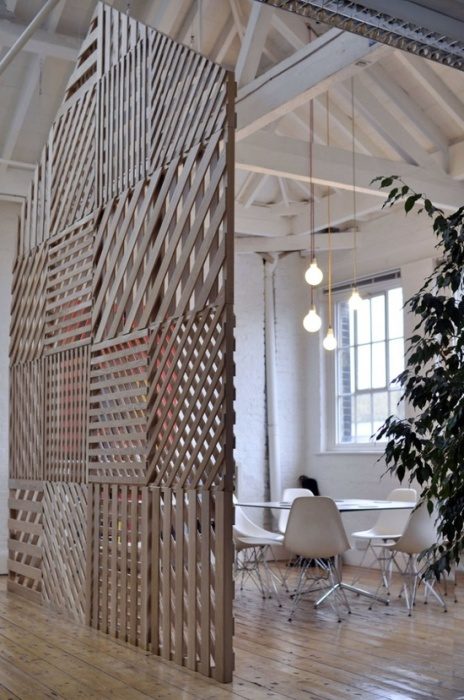 Деревянная перегородка может быть не только функциональной, но и декоративной частью современного интерьера.