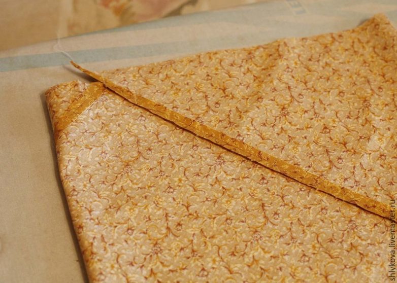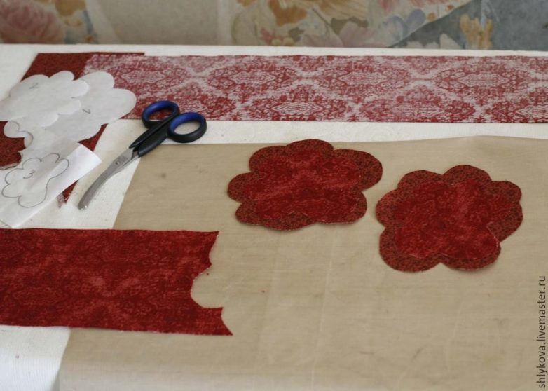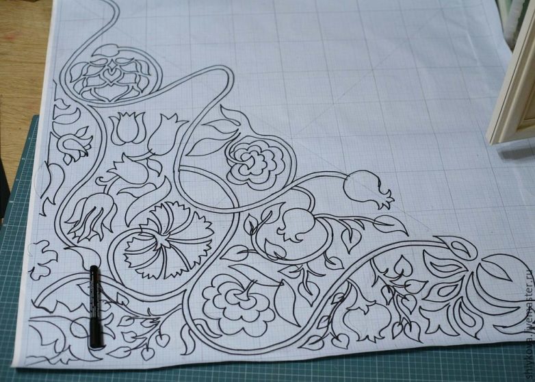 Наш отрисованный орнамент прикалываем булавками к изнанке ткани.