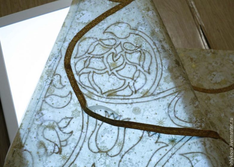 На лайтбокс кладем старый не очень толстый сэндвич проб со стежкой, на него рисунок, на ткань на просвет укладываем косую бейку, парим утюгом прямо по оргстеклу.