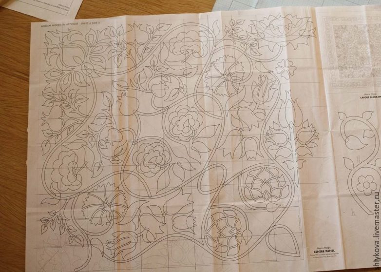 Изначальный дизайн в книге был размером 120*120 см, нужно было увеличить. Я взяла вкладыш книги и увеличила до нужного мне размера, отрисовывала сектор квадрат размером 90*90 см, т.е. центральная часть 90*90 см.