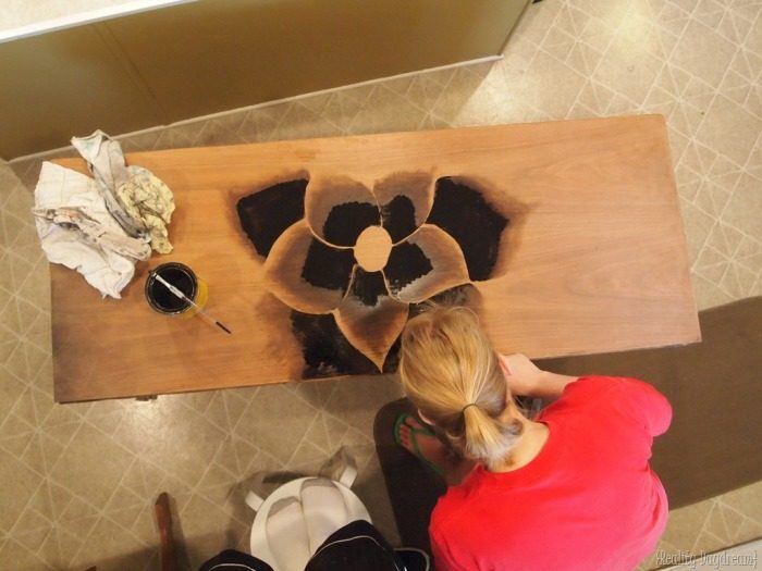 Легкими движениями простого карандаша на столешнице появились очертания крупных цветов. Далее в ход пошла морилка – жидкость, которая придает дереву другой оттенок. Бэт нанесла ее на ту часть рисунка, которая будет самой темной, ближе к центру цветка, а затем сухой тряпкой или даже пальцем растянула к более светлым краям.