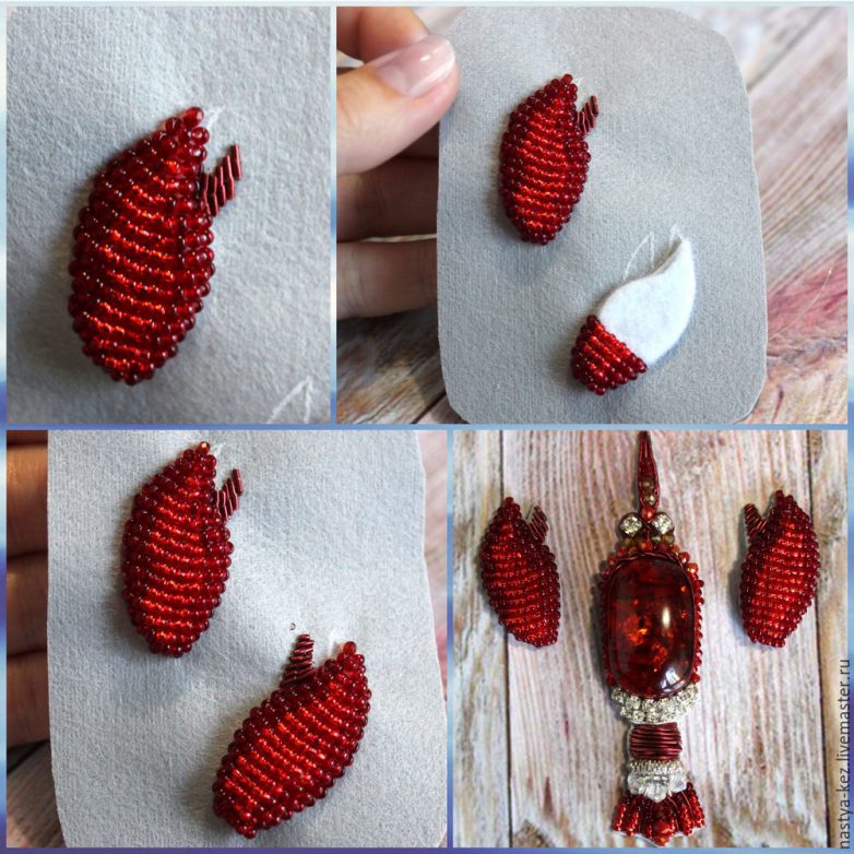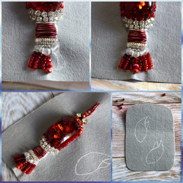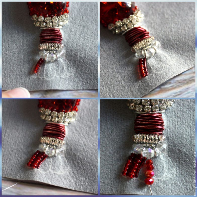 Выводим иглу у крайнего биконуса. Далее мы будем вышивать «хвостик», для этого берем чешский бисер двух оттенков красного. Пришиваем две темно-красных бисерины, потом несколько светло-красных — до нарисованной границы. Пришиваем полосочку красной канители. Повторяем все это еще раз. От центрального биконуса вниз пришиваем две красных рондели 3 мм и 2 рондели 4 мм.