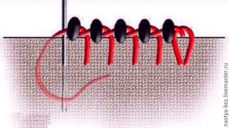 Отрезаем канитель красного цвета такой длины, чтобы она смогла обогнуть восьмерку вокруг глазок. После пришиваем её «восьмеркой», как показано ниже.