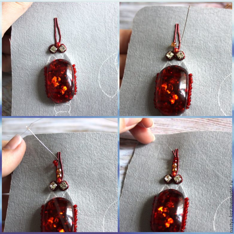 Пришиваем кабошон. У меня это имитация янтаря красного цвета с поблескивающей слюдой внутри. Выводим иглу у основания боковой стороны и вдоль пришиваем швом «назад иголка» ряд красных ронделей 3 мм. Затем выводим иглу у основания противоположной стороны кабошона и делаем то же самое.