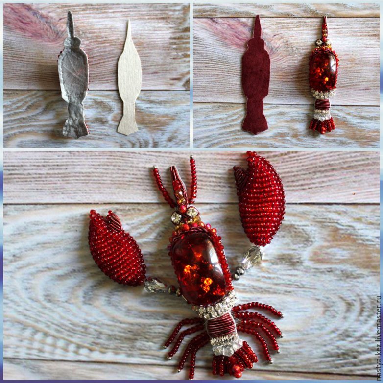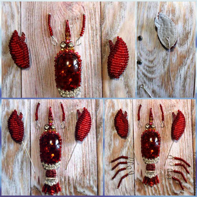Клешни «посадим» на пины с петелькой — пришиваем пин с нижнего края. Нижние ножки в количестве 8 штук делаем аналогично усикам, только красных бисерин нанизываем 9 вместо 7.