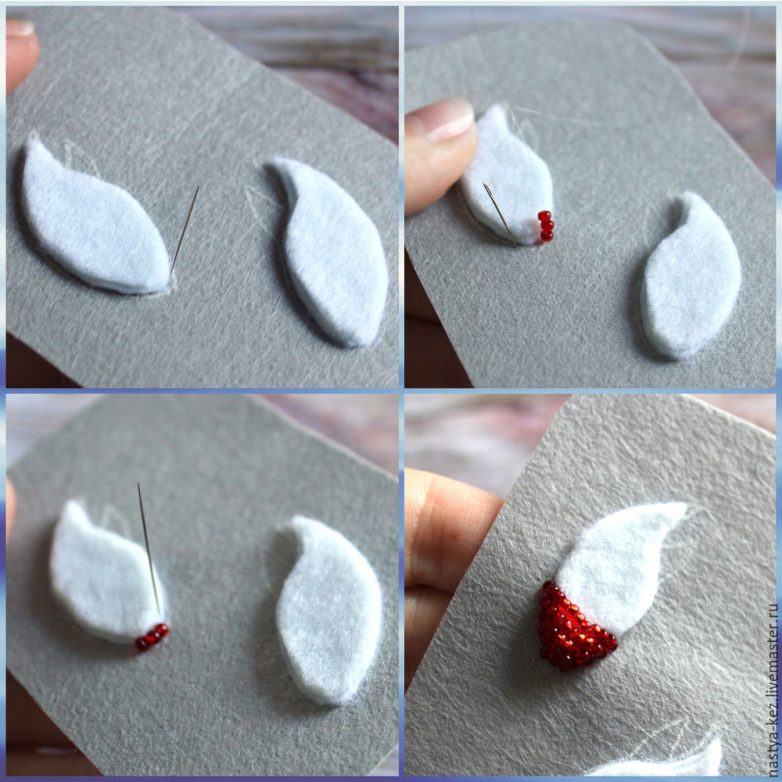 Выводим иглу у основания левой клешни, нанизываем три темно-красных бисеринки и пришиваем их поперек. Затем снова выводим иглу у основания, нанизываем нужное число бисерин (смотрите по вашему объему фетра) и пришиваем мостиком через «объем». Фиксируем в нескольких местах, прошивая через все фетровые слои. Продолжаем пришивать такие мостики из бисера, при этом по краям нанизываем темные бисерины, а в центре — посветлее.