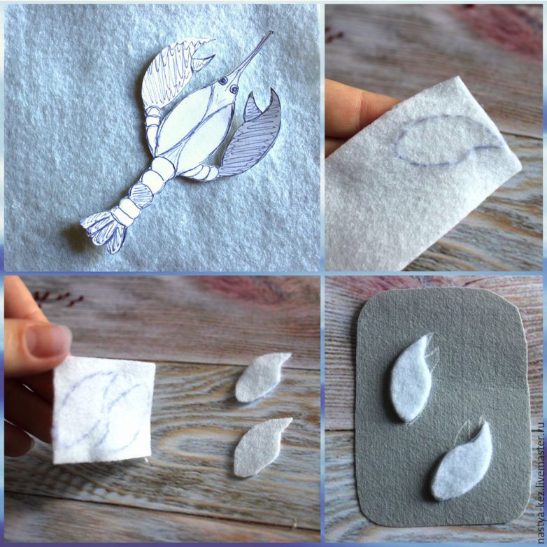 Для клешней мы также сделаем «объем» из фетра, для этого обводим эскиз и вырезаем по две детальки на каждую сторону. Приклеиваем. Обратите внимание, часть клешни (назовем её палец) остается без объема.