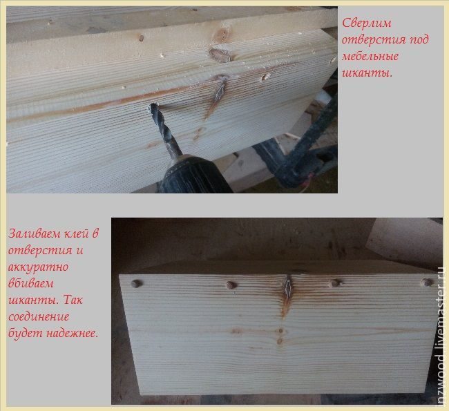 4). Сверлим отверстия под мебельные шканты. Заливаем клей в отверстие и аккуратно вбиваем шканты. Так соединение будет надежнее.