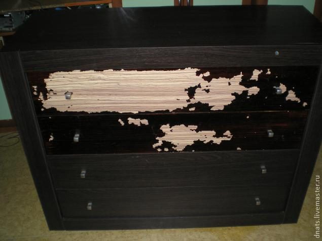 Ранее верхние два ящика комода были покрыты его хозяевами темным лаком, со временем лак облупился и получился вот такой неприглядный вид. Нужно было срочно исправлять положение.