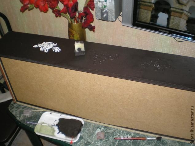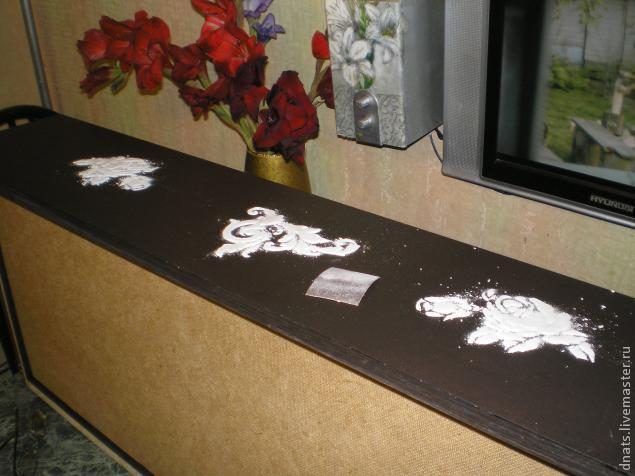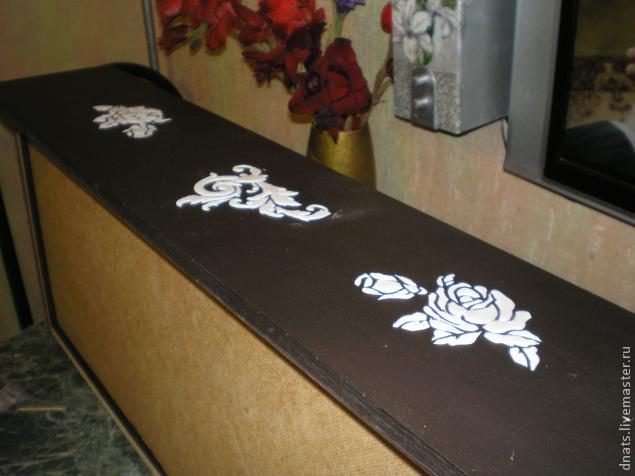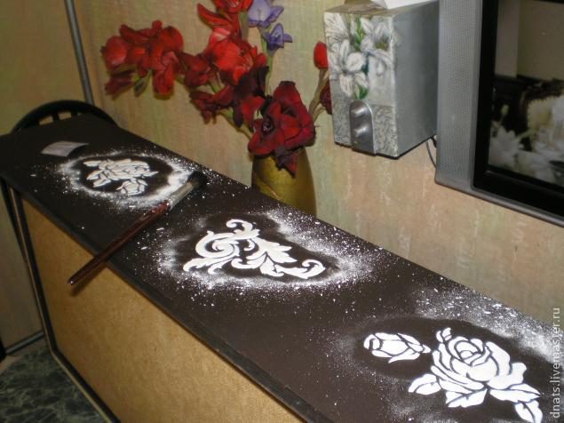 Когда краска просохла, чтобы не было так мрачно решила как то принарядить комод украсив его объемными розами методом наложения структурной пасты мастихином с помощью трафарета.