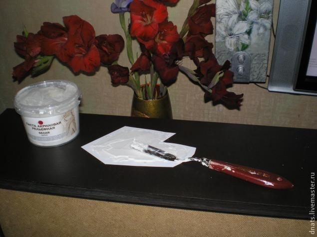 После полной просушки структурной пасты зачистила рисунок шкуркой и смела излишки сухой пушистой кисточкой.