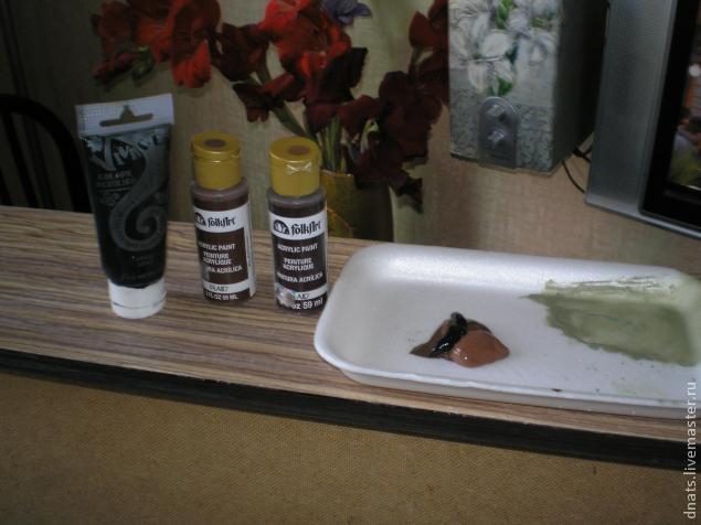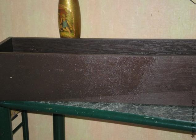 после этого смешала два оттенка коричневой акриловой краски, добавила черной и получившимся цветом похожим на цвет венге прочпокала всю поверхность ящиков поролоновой губкой.