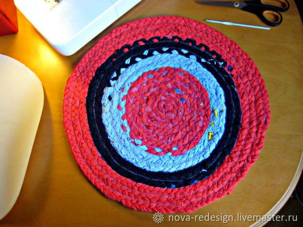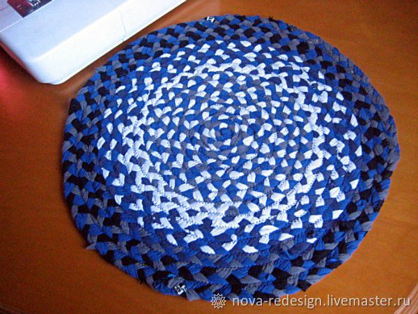 Получилось два коврика. Здесь на картинках видно, какую разницу можно поиметь в результате, если взять для косички полосы одного цвета (красный коврик) или же сразу разные (синий). Хвостик косички после сострачивания заправляем крючком в полотно коврика, всякие торчащие с изнанки уголки тоже можно заправить или аккуратно подрезать.