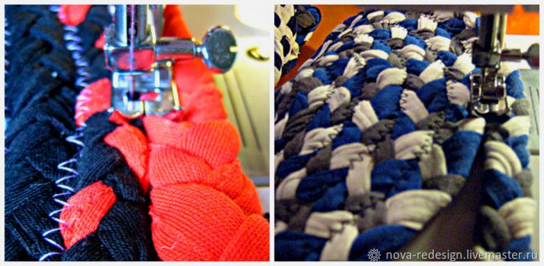 Далее, когда трикотажная коса готова, можно, разумеется, взять иголку и нитки и плотно сшить косички вручную. Но поскольку сейчас задача в максимально быстром изготовлении, то включаем швейную машинку и, постепенно сворачивая из косички плоскую спираль от центра по часовой стрелке, сострачиваем изделие швом зигзаг, плотно смыкая боковые края косички.