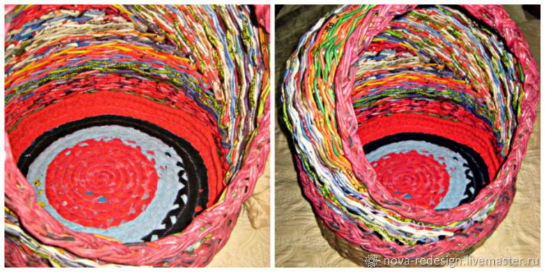 Далее сматываем нарезку в клубки и из получившихся полос плетём ровную, но не слишком тугую косичку. Когда заканчивается одна лента, привязываем или пришиваем к оставшемуся хвостику следующую полосу и продолжаем плести.