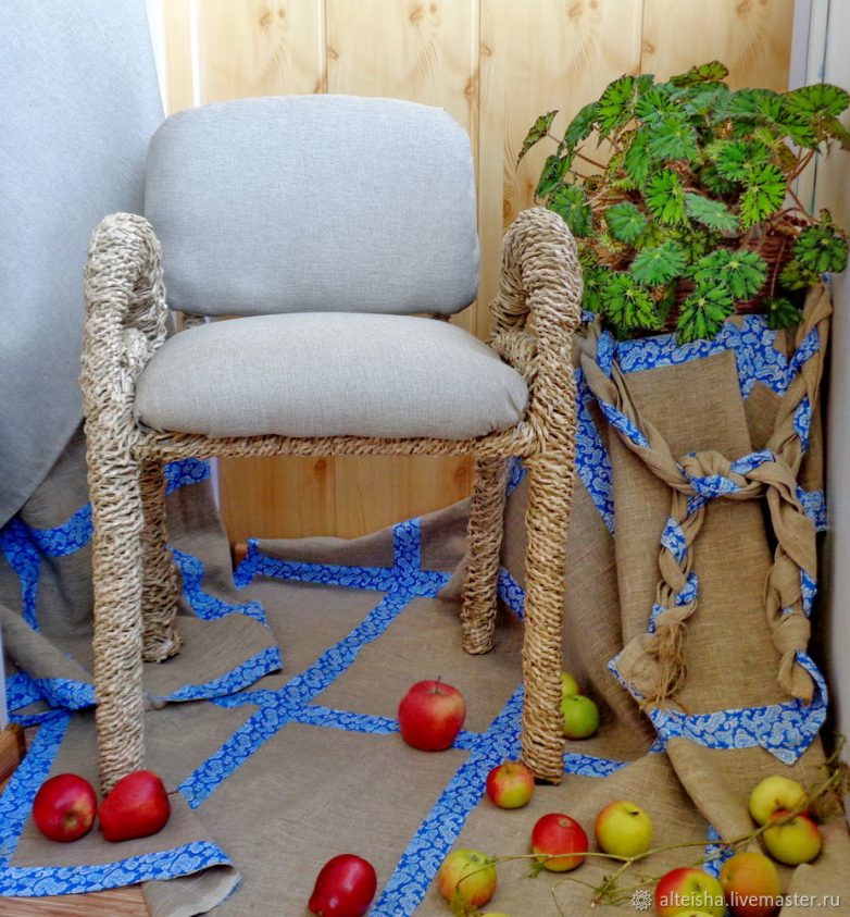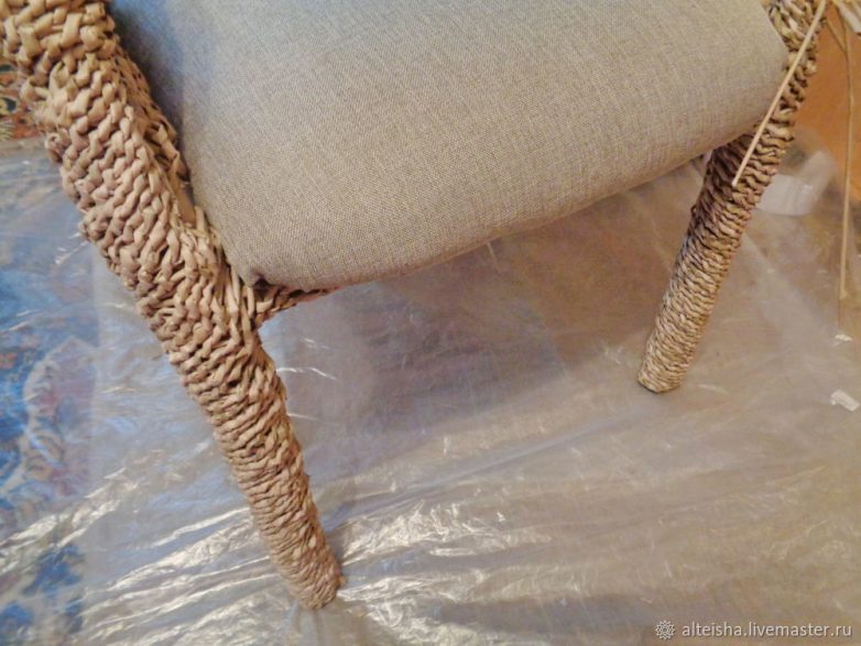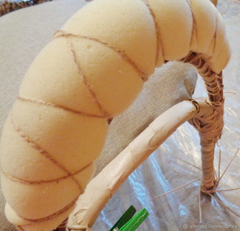 Размокшие ветки обтираю-излишняя влага нам не нужна. Плотно привязываю ветки к ножкам стула джутовой нитью, формируя необходимую высоту подлокотников. Из поролона формирую подлокотники, привязываю их джутовой нитью.