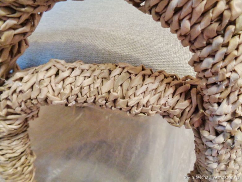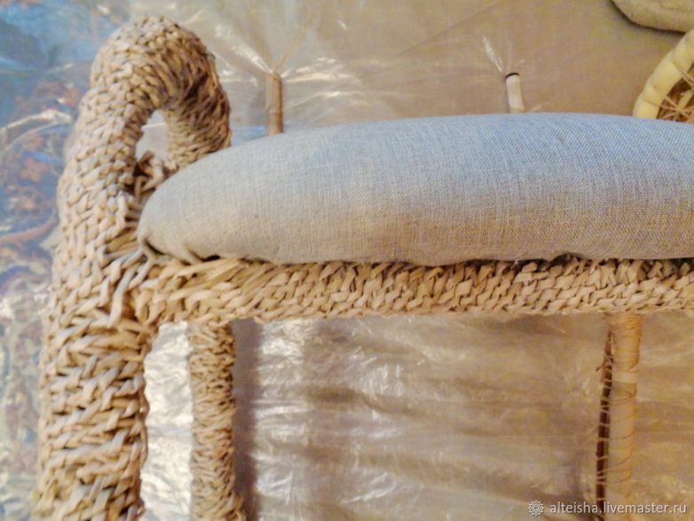 Для оплетки стоек, к которым крепится спинка, использую пучок из 6 трубочек с дальнейшим их наращиванием, начинаю плетение сверху стойки. В конце стойки выводу трубочки в косичку и закрываю шов, созданный степлером. Очень аккуратно! Такую же косичку кругом пускаю под сиденьем — все швы закрыты!
