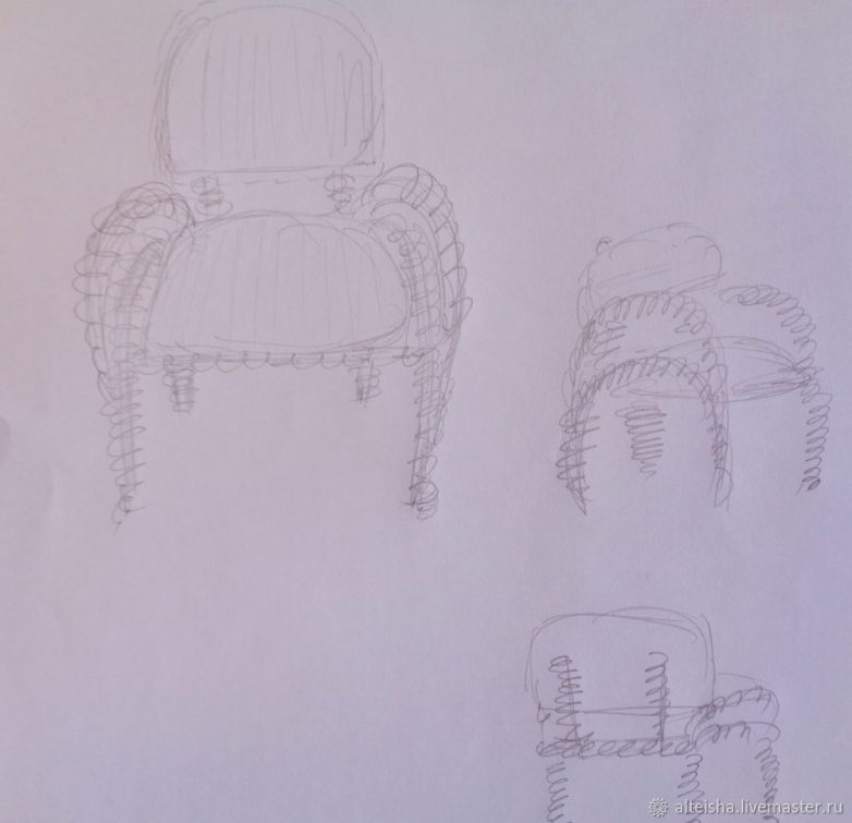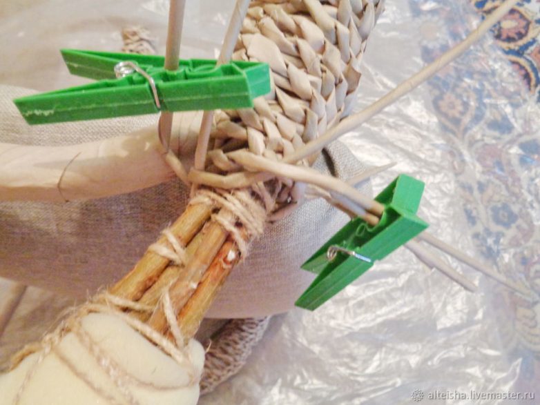 По мере необходимости наращиваю трубочки, используя клеевой пистолет, так как необходимо прочное и быстрое соединение, и прищепки. Оплетка ножек плавно перетекает в оплетку подлокотников.