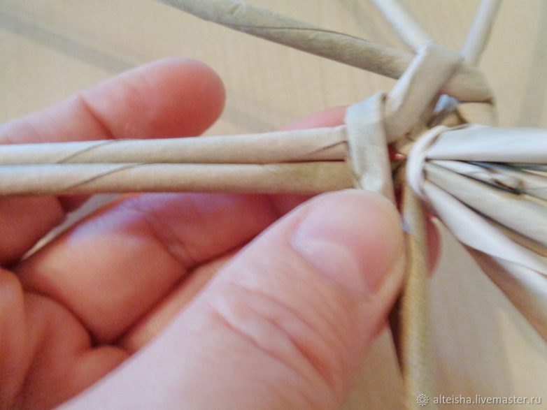 Ставлю ножку в центр чулочка и начинаю спиральное плетение вверх. Схема плетения (направление — в удобную для вас сторону в зависимости от того, вы левша или правша): пусть условно у трубочек будут номера 1, 2, 3,4,5,6,7,8. Трубочка №1 ложится поверх трубочек №2 и №3. Трубочка № 3 ложится поверх трубочек №1 (т.к. она при перемещении оказалась рядом) и трубочки № 4. Трубочка № 4 ложится поверх трубочки №3 и №5, № 5 поверх №4 и № 6, № 6 поверх №5 и № 7, №7 поверх №6 и №8 и так далее.