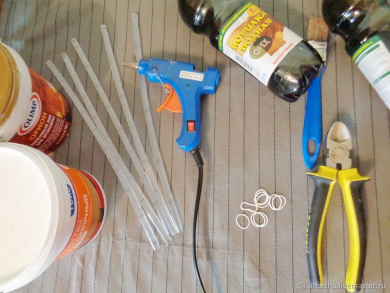 Морилка на водной основе «Орех» (из расчета 1 пластиковый стаканчик / на 100 трубочек), грунт пропиточный, пульверизатор, кисть, пистолет клеевой, клеевые стержни, прищепки, клей ПВА столярный, акриловый лак для древесины, резиночки для плетения — 6 штук (на 4 ножки и 2 стойки спинки стула), пластиковый стаканчик для смешивания морилки и грунта, кусачки.