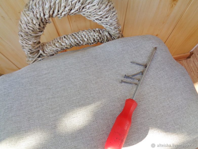 Наступает очень ответственный момент. Сиденье закрываю полиэтиленом. Оплетку нужно хорошо промазать столярным клеем ПВА и дать просохнуть в течение 2 суток. Когда клей высохнет, покрываю оплетку акриловым лаком для древесины. Через полчаса после нанесения лака проверяю поверхность. Убедившись, что она не прилипает к рукам, обминаю изделие. В этом состоянии оно очень податливо, можно поправить форму, ненужные выступы и прочее. Оставляю на 1 сутки сохнуть.