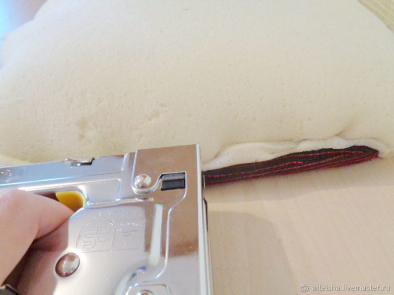 Пристреливаю строительным степлером ткань к сиденью и спинке, стараясь хорошо натянуть полотно, чтобы не было заломов.