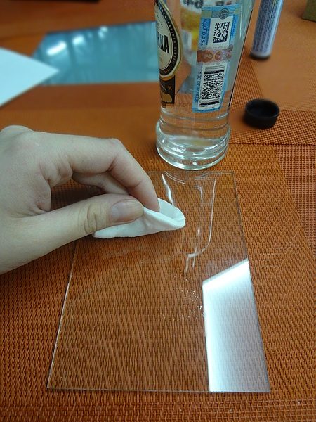 Берем обычный спирт (водку) и тщательно протираем каждое стекло. Затем вытираем насухо салфеткой. Обезжирить стекло можно просто помыв его с мылом. После этого накладываем первое стекло на бумагу. Некоторые мастера фиксируют его скотчем, но я этого не делаю — мне удобно и так.