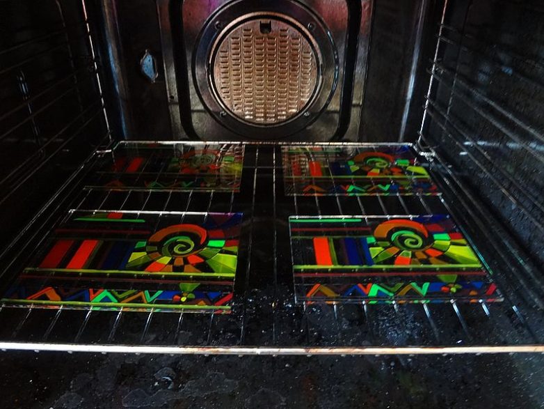 Итак, после полного высыхания красок и контура можем приступать к запеканию. Все инструкции есть на тюбиках и баночках, поэтому гадать сколько и при какой температуре нужно запекать не приходится. Устанавливаем температуру в 160 С и в ХОЛОДНУЮ!!! духовку кладем наши стекла. После того, как все запеклось мы ни в коем случае НЕ ВЫТАСКИВАЕМ их из духовки, а оставляем стекла внутри до полного остывания.