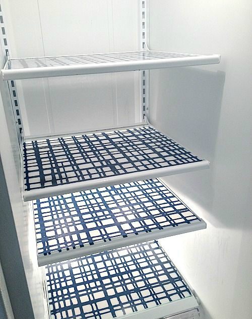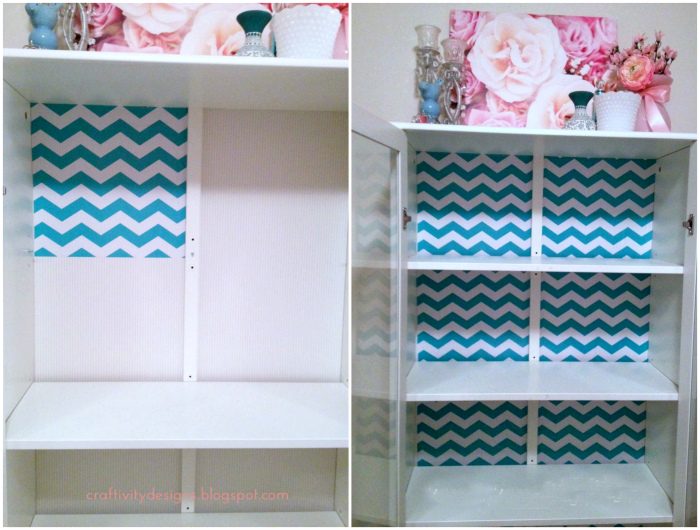 Яркую самоклеящуюся бумагу с узорами можно использовать для декора внутренних стеной полок и стеллажей.