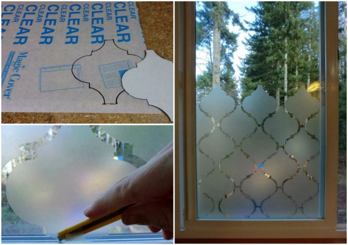 Преобразить стеклянные части кухонных шкафчиков или входных дверей можно с помощью витражной или матовой самоклеящейся пленки.