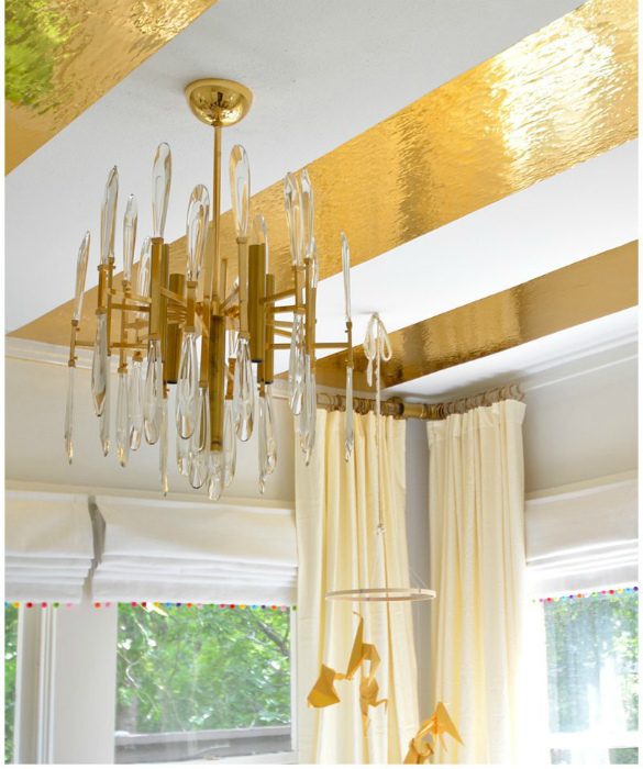 С помощью широких золотистых полосок самоклеящейся бумаги можно здорово преобразить скучный однотонный потолок и кардинально изменить динамику всего пространства.