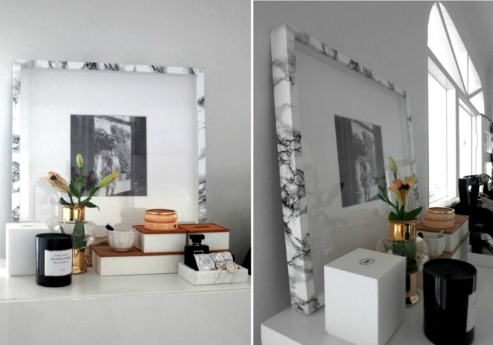 Остатки самоклеящейся пленки можно использовать для декора рамок для скучных картин и фотографий. Например, рамочки, обклеенные пленкой под мрамор, выглядят очень изысканно и прекрасно впишутся в интерьер современной спальни или гостиной.