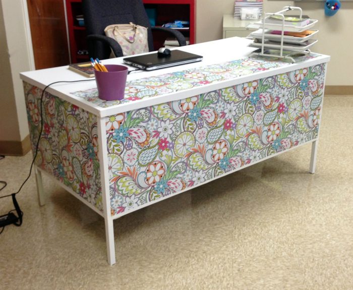 Стол, украшенный яркой самоклеящейся пленкой.