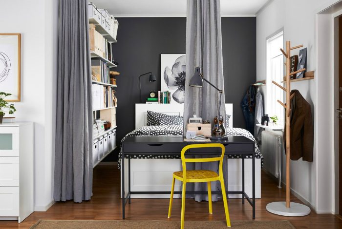 Спальня за шторками в нише и яркий желтый стул.