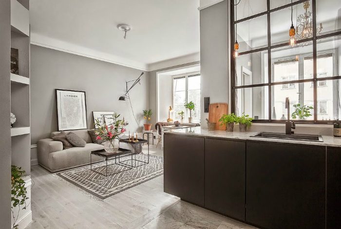 Изумительный интерьер квартиры-студии, оформленной преимущественно в серых тонах, с потрясающей дизайнерской мебелью, оригинальными светильниками и чудесными предметами декора, которые делают это помещение по истине уникальным.