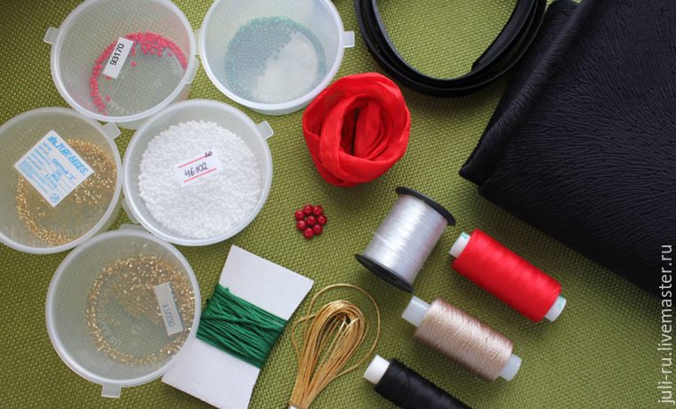 2. Нитки: х/б (красный, черный), тонкая леска, капрон 50к (белый и бежевый), мулине зеленый ПНК им. Кирова 4112, мулине металлизированный Anchor Lame 303 (светлое золото).