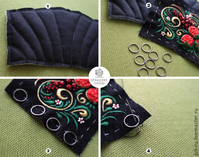 8. К краю основной ткани браслета с вышивкой пришиваем колечки по намеченным линиям.