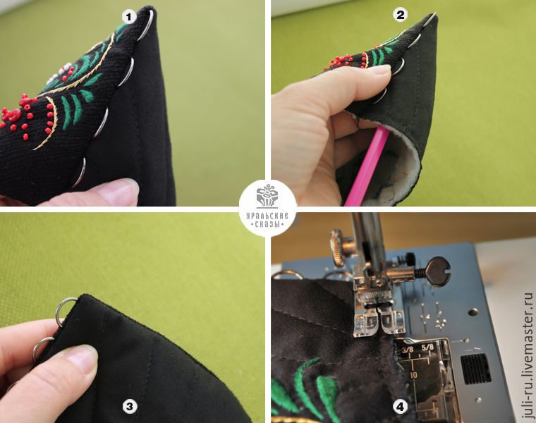 21. Аккуратными мелкими стежками фиксируем уголки и таким же образом подшиваем косую бейку к подкладке.
