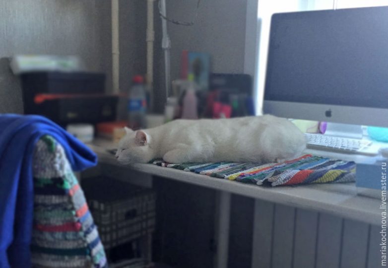 У меня остался четвертый коврик, и, по-моему, он замечательно смотрится на столе. А как приятно положить на него, а не на холодный стол руки. А Кузьма Кузьмич залегает на нем только так!