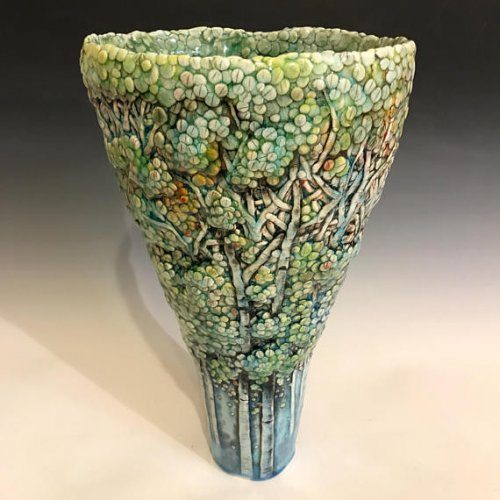 Художница добивается такого впечатляющего эффекта благодаря нескольким слоям подглазурной росписи и множеству тонких слоёв пигментированной глины. Когда подглазурные слои взаимодействуют во время обжига в печи, великолепные чаши и вазы оживают!