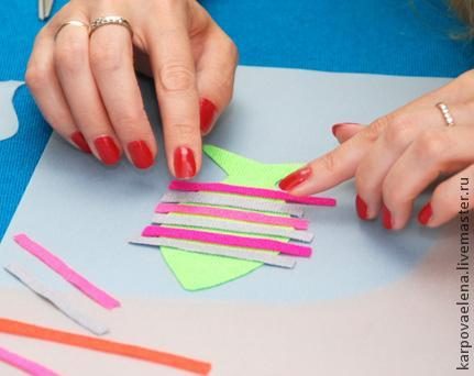 Для упрощения работы по созданию многоцветных деталей аппликации (в моём случае это рыбка с полосками), вырежем точно по контуру крупную фоновую деталь (тело рыбки), а более мелкие детали (полоски) вырежем с запасом длины и разместим на фоновой детали клеевым слоем вниз.