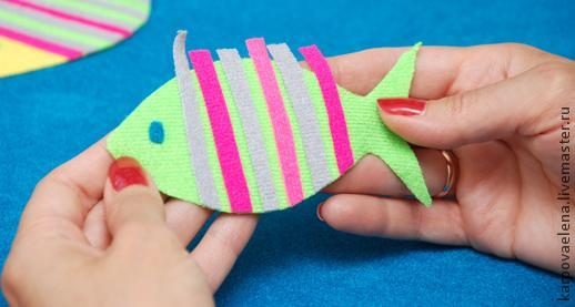 Теперь выступающие полоски легко сравнять с деталью тела рыбки, отрезав по контуру основной детали все лишнее.