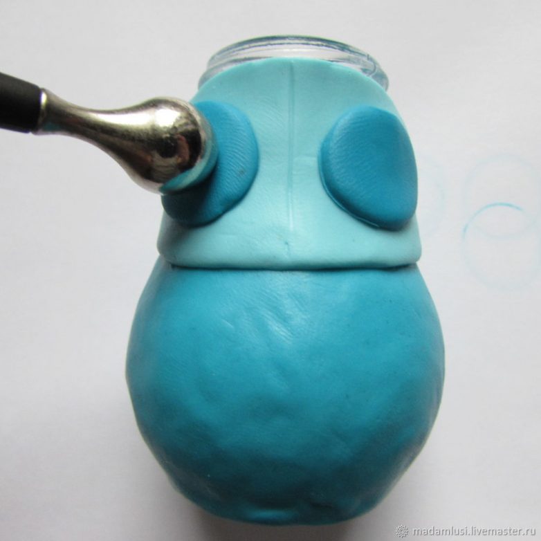 И последний элемент — глаза. Из глины белого цвета вырезаем одинаковые по размеру кружочки, немного их скругляем и помещаем в углубление глаза. Прижимаем, стараясь не оставить отпечатков пальцев (можно на этом этапе надеть перчатки).