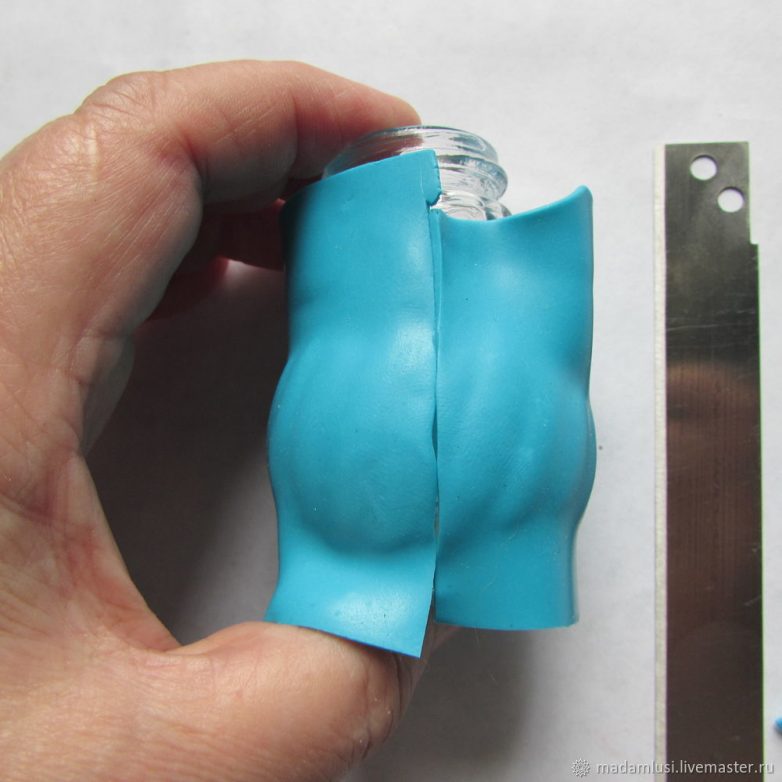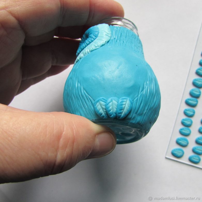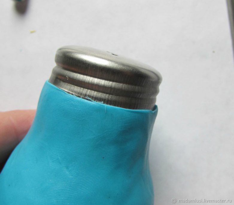 Ножом срезаете излишки внизу солонки и под резьбой. После того как излишки удалены, нужно хорошо примять глину к стеклу чтобы удалить воздушные пузырьки (чтобы удалить воздушные пузырьки, их надо проткнуть иглой и заровнять поверхность), которые могут образоваться при работе и сгладить рифленные грани. Оденьте крышку и обрежьте глину под крышку.