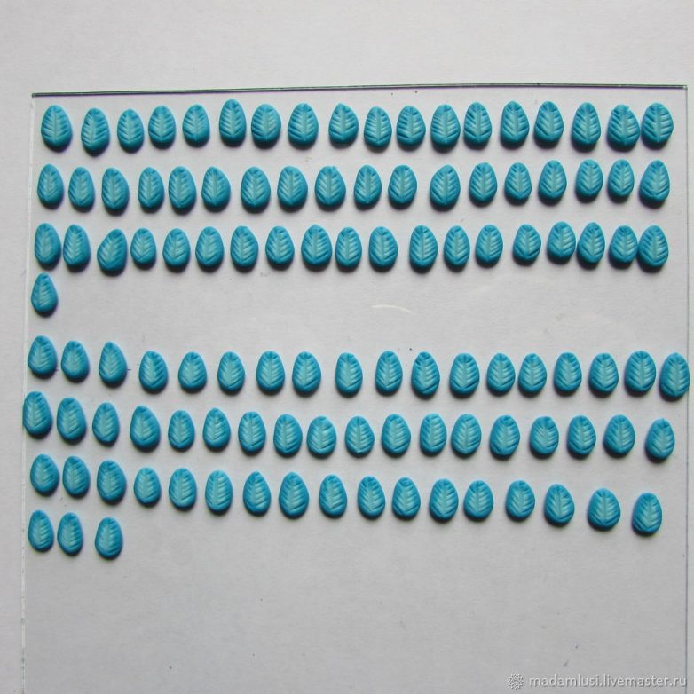 Я нарезаю колбаску на одинаковые кусочки и укладываю их на стекло, придавая каждому кусочку форму листа, затем делаю насечки как на листочке.