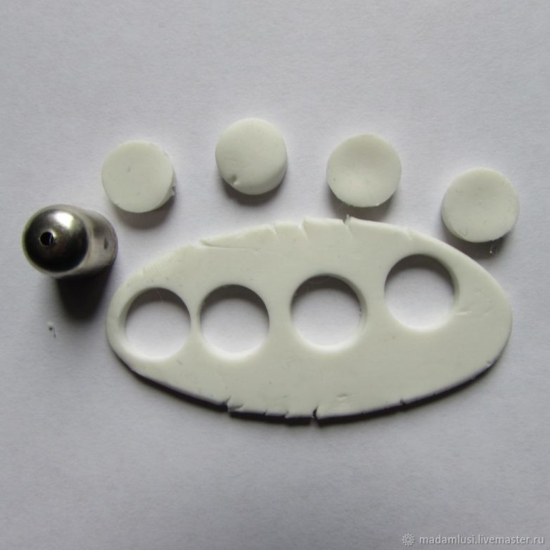 Теперь пришла очередь самой темной глины. Раскатайте ее тоньше, чем овал примерно 3 мм и каттерами или любыми подручными средствами (у меня это колпачок от губной помады) вырежьте 4 кружочка диаметром примерно 1,7 см.